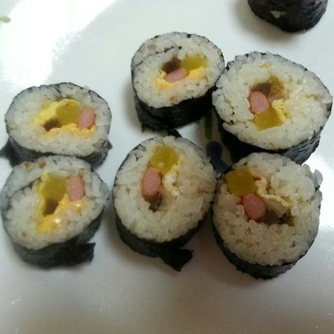 감자넣고 사진으론 잘안보이지만 밤 버섯도 넣고 맛나게만들어 쐬주한잔 했어요초간단 김밥 재료가 없어서 햄 계란 단무지 김치 우엉를 넣었어요