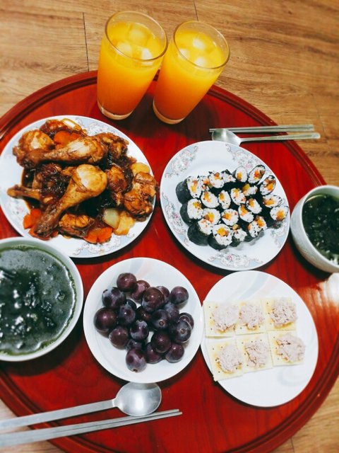 찜닭&미역국&꼬마김밥&포도&참치카나페