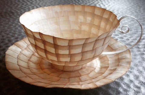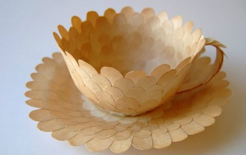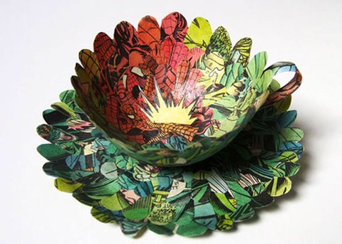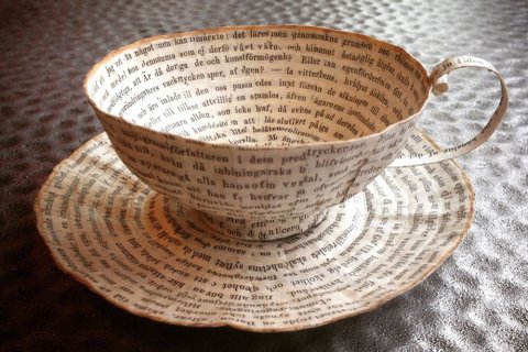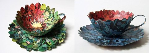 스웨덴 아티스트 세실리아 레비(Cecilia Levy)는 오래된 빈티지 종이로 멋진 입체의 컵과 접시 작품들을 선보였다. 제본 기술을 지닌 전직 그래픽 디자이너로 책을 해부 실험하며 새로운 종이 입체 작품을 만들어내고 있다. 평면의 오래된 종이가 입체의 형태를 구성하며 현저히 다른 이야기를 전해주고 있다. 세실리아 레비는 예테보리 디자인 공예학교에서 그래픽 디자인 석사를 받은 후 2년과5년의 두 기간동안 디자인 교사로 일했다고 합니다. 손으로 하는 작업을 좋아하던 그녀는 그래픽 디자인, 제본, 그림을 결합하고자 Leksands Folkhogskola에서 다시 제본을 공부한 후 자신의 작품을 만들기 시작했다고 합니다. 그리고 그 제품들은 현재 웁살라의 KALEIDO Konsthantverk (예술과 공예 협동 조합)에서 판매되고 있다고 합니다. 지금은 스웨덴 국내외의 디자인전과 전시로 바쁜 나날을 보내고 있다고 합니다.