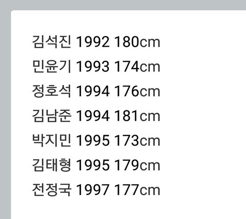 남준81 진태형79 정국77 호석76 윤기74 지민73