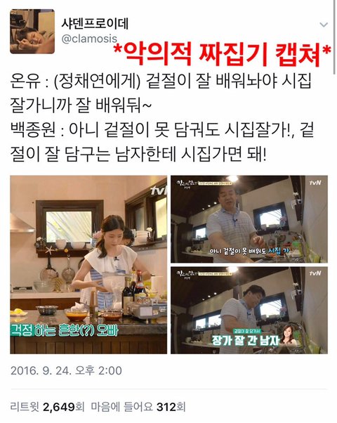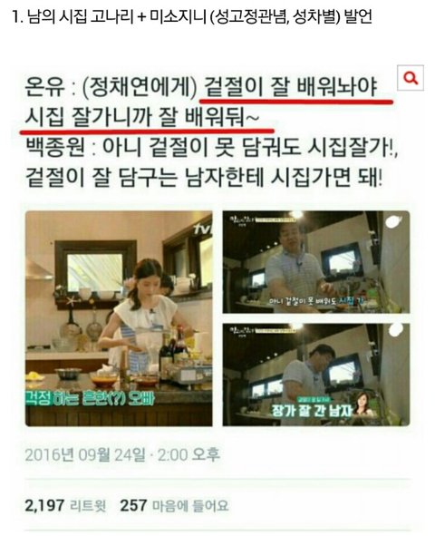 온유, 정채연, 백종원이 요리를 하며 이야기를 나눈 부분 중 온유의 발언이 여혐 발언이라며 악의적으로 편집된 캡쳐본이 트위터에 올라옴