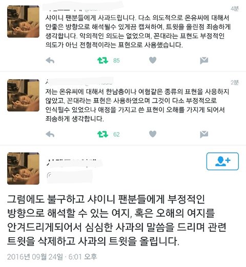3. 커뮤니티에 악의적 캡쳐 글이 퍼지고 한참 지나서 논란의 시작이 되었던 트윗의 주인이 문제가 되자 사실 관계 확인 후 뒤늦게 사과 트윗을 올림.