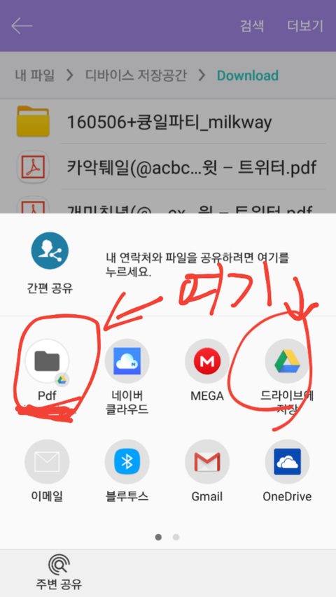 5. 파일 선택후에 '드라이브'에 저장해서 메일보내면 됨ㅎㅅㅎ (이름보여서 수정함;; 난 드라이브에 pdf파일 아예 만들었어ㅋㅋㅋㅋㅋ 아무거나 누르면 됨)