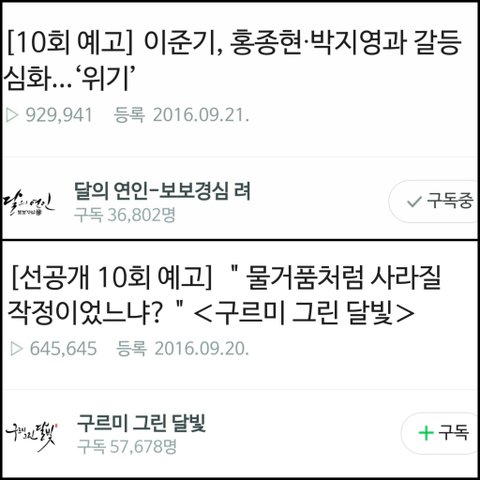 항상 본방 끝나면 네X버 티비캐스트에서도Top100에서 항상 순위권이고 가장 최근 예고편도 동시간대 드라마인 구르미보다 조회수 훨씬 높은데 (둘다 10화예고로 가져왔어 심지어 달연이 등록일 하루 더 늦어ㅜㅜ)