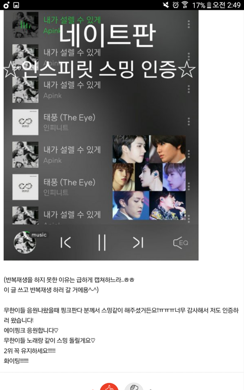 나 평소에 에이분홍님들 진짜좋아하는데 노래듣고싶은거 꾹참고있거든 내 우선순위는 언제나 인피니트니까ㅜㅜ같이 으쌰으쌰하는건 좋은데 그런것도 시기를 잘 봐가면서해야한다고생각해.....ㅜ활동시기에 타가수랑 겹치게듣는건 지금까지 스밍돌린거 다 무산되게하는건데 왜그럴까....