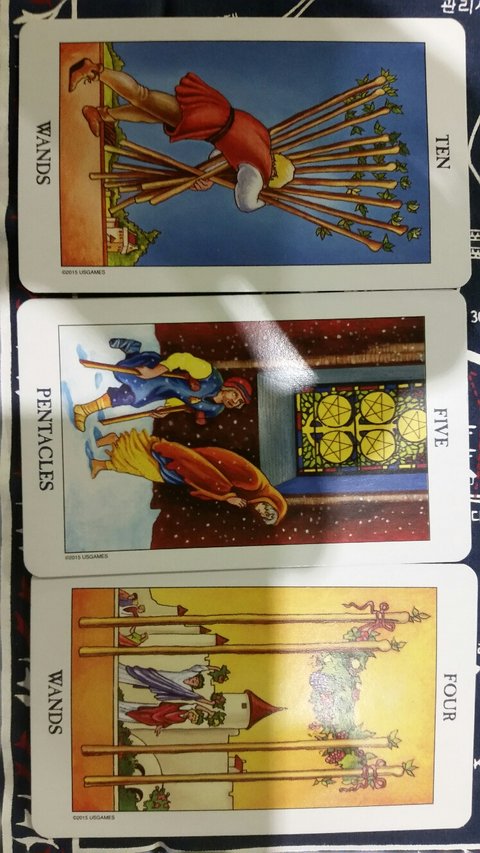 첫번째 카드는 에스양을 자르는 것때문에 상당히 부담을 가지고 있고 두번째 카드는 자르게 되면 물질적인 곤경을 당한다는 뜻이다. 그리고 세번째는 만약 자르면 마음의 평화를 얻는 다는 뜻이다.