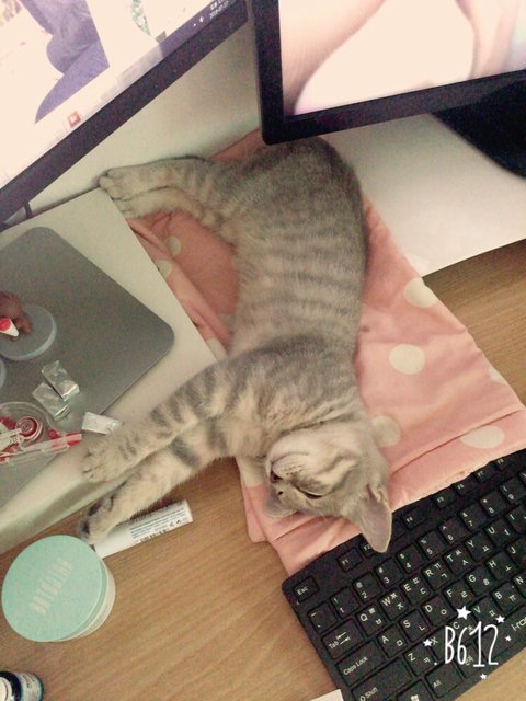 컴퓨터 하면 항상 저기서 자길래 천 깔아줬어요! 배가 통통하네요~~고양이는 포동해야 제맛이죠?