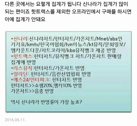 온라인-신1나라, 오프라인-핫!트랙스 에서 사자는 말이야. 신1나라와 핫!트랙스는 앨범 산 게 한!터차트에 안 누락되고 집계가 잘 돼! 가격 비싸서 할인된 거 사고싶다고 티1몬 같은데서 사면 이삐들이 아무리 많이 사도 집계 절대 안 돼..그런 짓은 하지말자ㅠㅜ