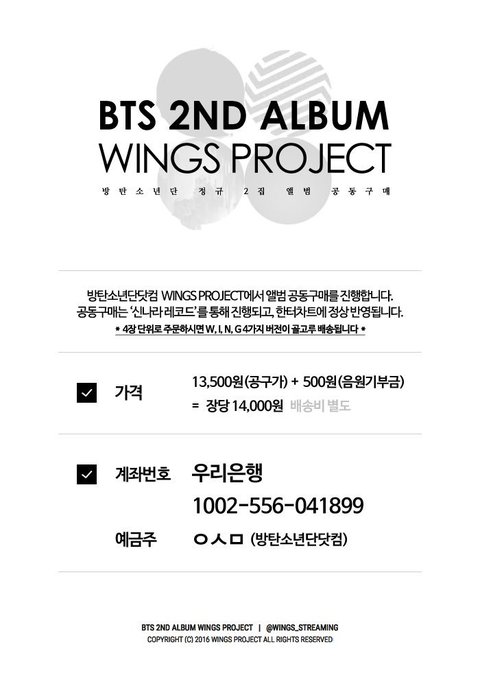 음원총공은 곡을 다운로드하는 방식으로 이루어질거고 여기에 사용되는 비용은 1.음원총공비 모금 2.방/닷에서 진행하는 앨범공구에서 충당(공구가격13500원+음원모금비500원=14000원이 공구가격/신나라O,팬싸응모X)
