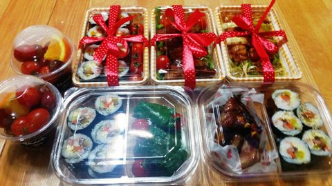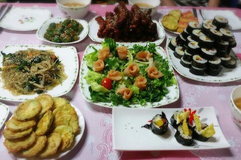 여기에는 매콤이등갈비,오이된장박이,김밥,호박전,잡채,연어샐러드에요