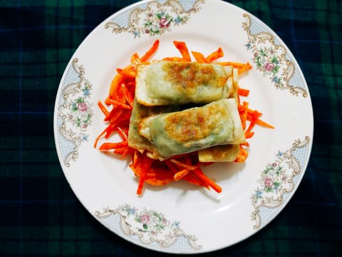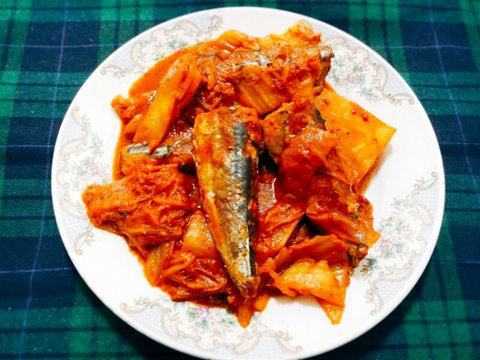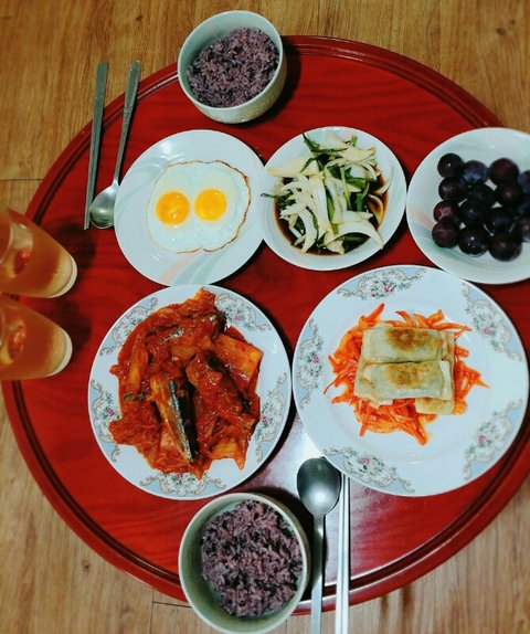 흑미밥&계란후라이&미나리무침&포도&김치꽁치조림&비빔만두