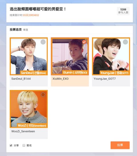 큐트력 만렙 아이돌 웨이보 투표 링크래 트윗에서 보고 퍼왔음 로그인하고 투표해야함 웨이보 아이디 있는 웅녀들은 꼭 참여하자 혹시 트윗하는 웅녀들 중에 아직 참여안한 웅녀들은 리트윗하고 하트 누르는 것도 잊지말고!!! 근데 이런 투표 왜 자꾸 할까? ㅋ 민석이 1위 할때 보니까 그냥 1위입니다!! 하고 끝나던데 >.<;;;