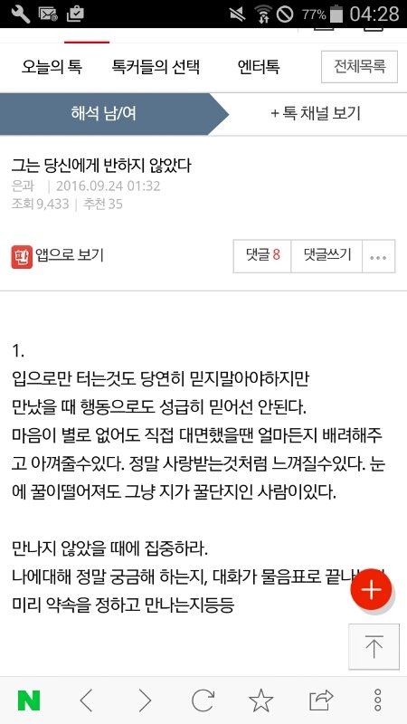 얼마전에 해석남녀에서 주운건데.. 정말 좋아하면 만나지 않았을때도 나에대해 궁금해하고 연락을 계속 이어나가려고 하겠죠?