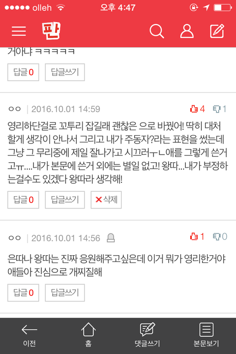 +) 하핫 이거 왜 톡선이야ㅋㅋㅋㅋㅋ그리고 은따가 아니라 왕따라 하는거 좀 많이 어이없당ㅎㅅㅎ....친구가 있긴이써! 은따는 은근 왕따고 왕따는 아예 따돌림 당하고 친구 없는거 아닌가....? 내가 왕따였으면 보성가고 싶다고 말하지도 않았을껄 걍 가만히 있었을듯..(왕따 비하 아니야ㅠㅠ내가 은따인데 누굴 비하하겠움) 암튼ㅋㅋㅋㅋㅋㅋ긍정적인척 하는거라 생각 해 걍ㅎㅎ 긍정적이게 보였으면 다행이넹! 글고 베댓아 은따 부정 안해ㅋㅋㅋㅋㅋㅋㅋㅋㅋ뭔 본문이랑 제목에도 떡하니 나보다~은따 이렇게 되있는데 뭔 부정이얌..^^ 너가 말투 그래서 나도 좋은 말투로는 못받아드리겠다 미안