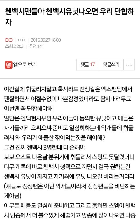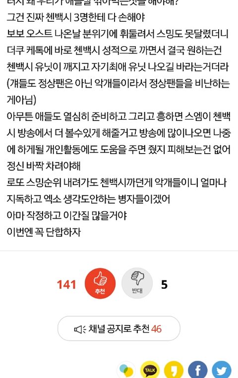 첸백시팬들 단합하자니까 반대 5개밖에 안찍힘ㅋㅋㅋㅋ 엑소팬덤에서 싫어한다고 정치질하더니 오픈톡판 악개 5마리가 일당백으로 첸백시 견제하는거였음