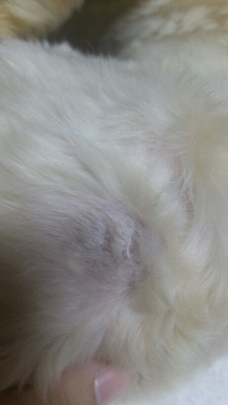 그런데 제목그대로 어제까지만해도 못봤는데 방금보니 엉덩이쪽에 멍처럼 색이 어둡고 껍질이 벗겨지고 있으면서 털이 그부분에 없어요