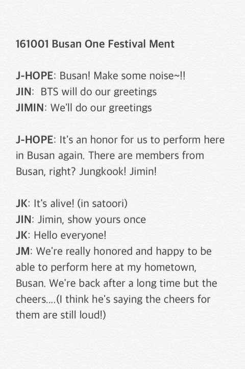 제이홉 : 부산에서 다시 공연하게되어서 영광이네요. 여기 부산 출신 멤버들 있잖아요, 그쵸? 정국이! 지민이!