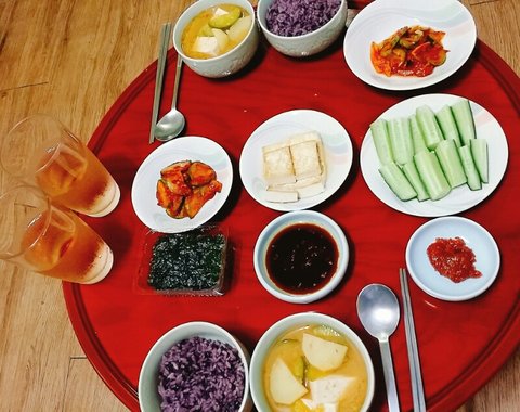 흑미밥&된장국&애호박볶음&김&두부부침&오이&오이무침