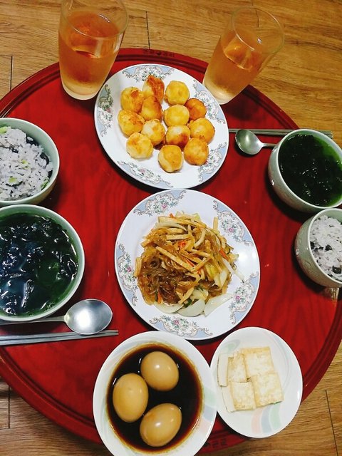 콩밥&미역국&감자볼&잡채&간장계란조림&두부부침