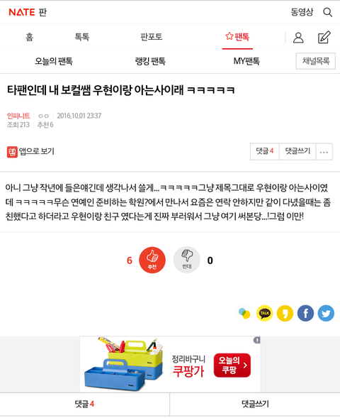 타팬이 본인 보컬선생님이랑 우현이랑 아는사이였다는