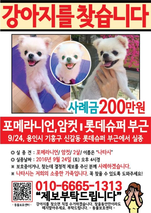 1. 장소: 경기도 용인시 신갈동 롯데슈퍼 부근2. 이름: 나타시 3. 성별: 여 4. 견종: 포메라니안 / 2세