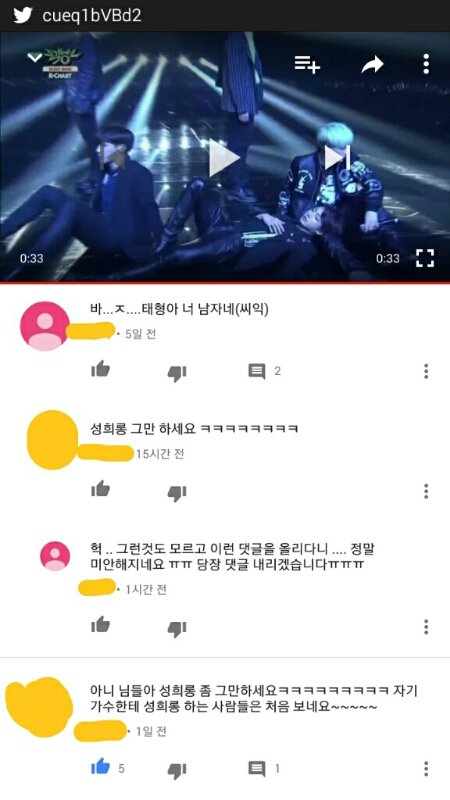너툽 어떤 이삐 한명만 성희롱 하지 마라고 하고 다니는데 댓글에 하지 말라고 달면서 신고 한번씩 하고 오면 안되나? 진짜 너무 심하다ㅋㅋㅋㅋ