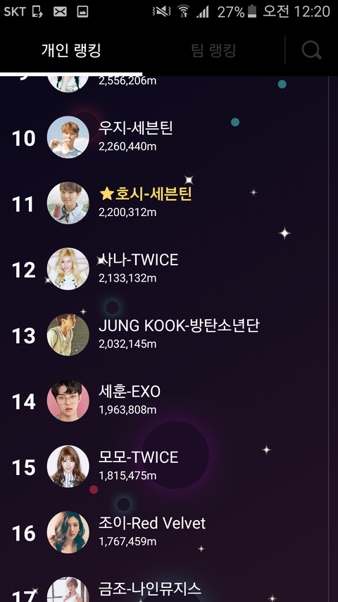 캐럿들 지금 팬심이라는 앱에서 하트만들어서 보내는것 가지고 연예인 순위전 하고있는데 많이 밀리고 있어요ㅠㅠ 캐럿화력다 어디간거에요ㅠㅠ이거 한달에한번 순위 갱신되는데 순위 높은 스타는 스타이름으로 앱만든 회사에서 기부도 해준데요...순위 계속 낮아지고 있고 우지나 호시 이외의 멤버들 순위는 정말 처참해요...게다가 앱내에 등록된 팬수가 고작114명 밖에 안된다니ㅠㅠ우리세븐틴기좀올려줍시다!!제발도와주세요!