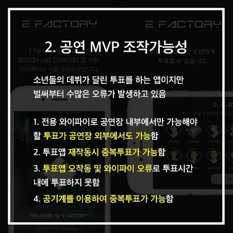 현재 공연 MVP 투표는 ‘E-Factory’라는 어플로 진행되고 있습니다. 공연장의 와이파이를 사용 할 시에만 작동되는 구조였던 어플이 최근 다른 와이파이에서도 실행이 되는 일이 생겼습니다. 공연을 보러가지 않은 팬들의 어플에 현재 공연 중인 무대의 가사가 뜨는 등 어플에 허점이 많습니다.