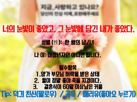 우리 예랑님 예신님에게 식전영상을 협찬해드려요 (1차협찬)댓글에 이름만 적고가세요,예비신랑님 예비신부님과 함께하는 친구태그..♡결혼식준비가 어렵다 친구태그..♡Tip. 덕긔 팔로우 + 공유 + 매리유 팔로우* 공짜라고 저퀄리티아니라고 준비 * 마케팅맡고있는 제가 5명이상으로 랜덤없이직접 하나하나 보고 뽑구요! 문의는 다이렉트주세요............#결혼식 #결혼 #식전영상 #웨딩준비 #예비신랑 #예비신부#결혼준비 #웨딩드레스 #드레스 #신랑 #신부 #결혼식 #식전영상 #스냅샷 #인물스냅#선팔 #맞팔 #팔로우 #소통 #일상 #소통해요 #댓글 #무료https://www.facebook.com/kkangsdn/posts/1058138350966396
