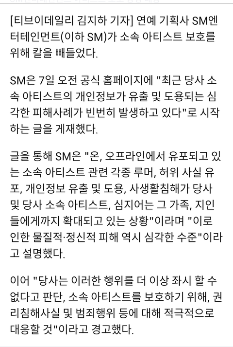 SM, 아티스트 보호 위해 칼 빼들어.."권리침해 및 범죄 좌시 않겠다"