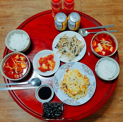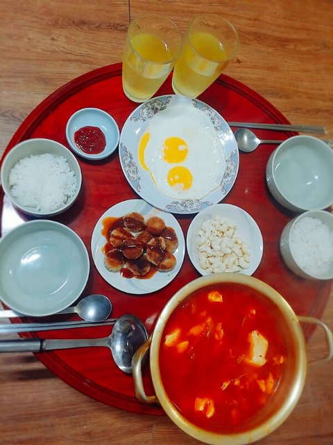 쌀밥&계란후라이&마카로니샐러드&돈가스&김치순두부국