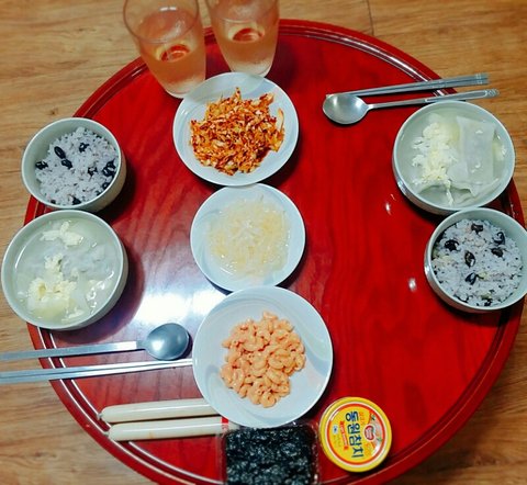 콩밥&만둣국&양배추무침&무나물&마카로니&김&통조림