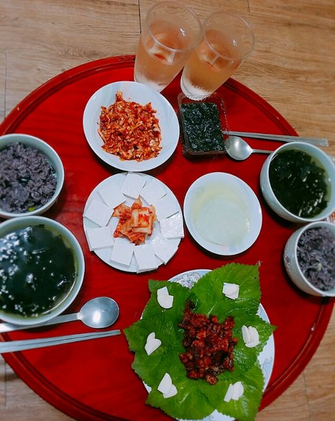흑미콩밥&미역국&양배추무침&김&쌈무&두부김치&닭발