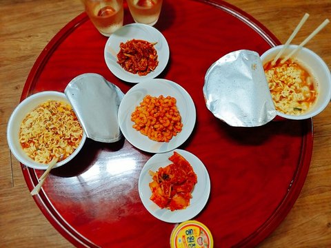 컵라면&양배추무침&마카로니&김치&통조림