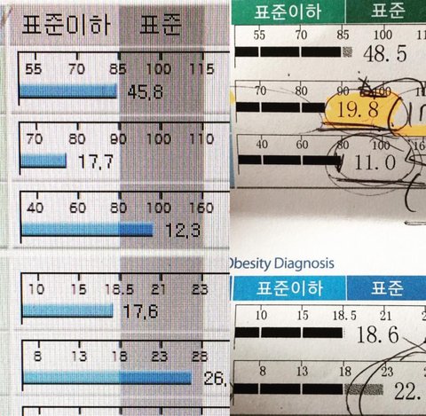 맨 위부터 몸무게, 근육, 체지방량, bmi, 체지방율입니다.