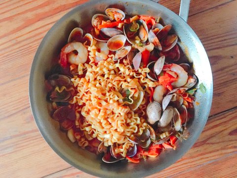 제가 새우를 제일 좋아해서 새우넣고 파스타를 자주 해먹어용 이건 파스타면 삶기귀찮아서 라면으로 대신했어요 볶음진*뽕 면이 파스타대용으론 최고인듯합니당