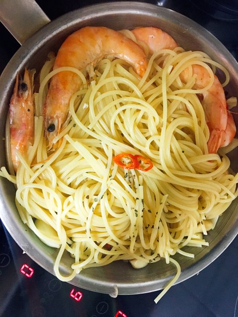 이거도 먹느라 급해서 다만들자마자 대충 찍은거밖에없네요ㅠㅠ 새우 남은거 다넣고(무려8마리..) 오일파스타 해먹었어요 새우는 언제먹어도 사랑입니다
