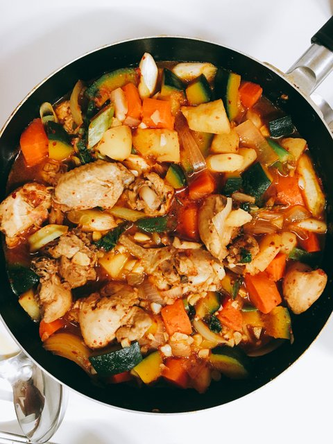 이거슨 닭볶음탕입니다 닭볶음탕은 닭도 맛있지만 푹익고 양념이 잘 배인 단호박과 각종 야채가 진리죠!! 야채는 투박하게 크게 썰어서 영롱한 닭님과 스케일은 맞춰줬어용