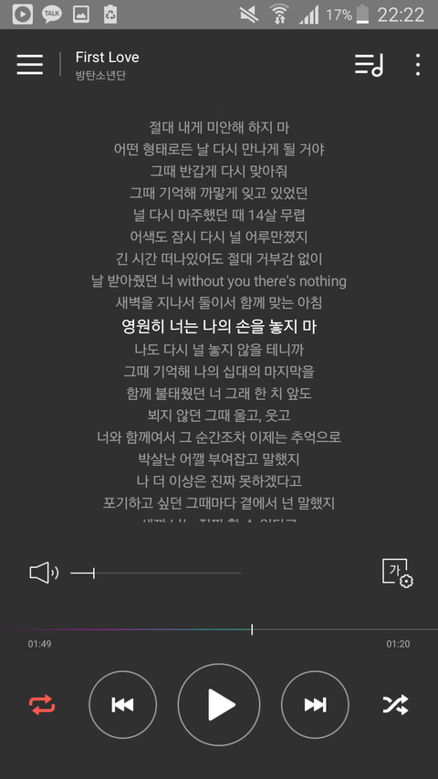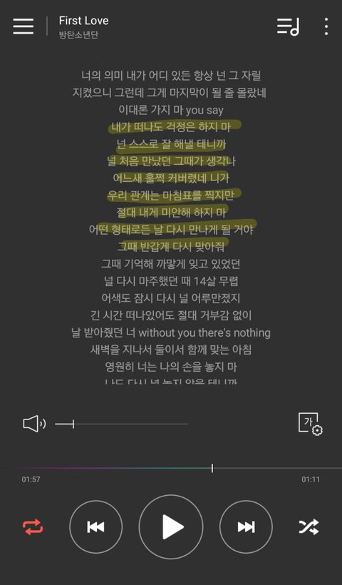 그 방금 아무생각 없이 듣다가 느낀건데 사진에 밑줄 친 부분 되게 호석이처럼 랩한다고생각했거든 약간 음?을 넣어서 랩을 높낮이 있게? 여튼 평소 윤기 랩스타일이 다른거야 그래서 가사 찾아보니깐 그부분 피아노가 윤기한테 말하는 거더라고...그 약간 노래부르듯 높낮이 준거 피아노가 말해서 그렇게 표현한거 아닐까..? 혹시 둥이면 미안!!빛삭할게!!