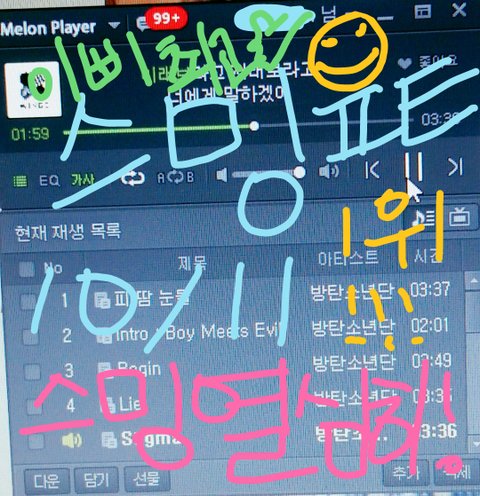 어제였나 스밍을 강요하는건 철없어 보인다고하는 글을 봤는데 스밍을 하라고 하는건 우릴 위해서 고생하면서 연습하고 준비한 방탄한테 보답하고 싶어서 그런거지..최고의 곡들에 최고의 결과를 보여주고싶어서 그런거야 팬으로써의 도리를 다 하고자 하는거지..그리고 이렇게 좋은 곡들을 사람들한테도 들려주고 싶어서.1위를 하면 노래가 얼마나 좋길래 차트 1위를할까?라는 생각이 들어서 들어보는 사람이 많아지잖아!그리고 빠져드는거ㅈi..☆