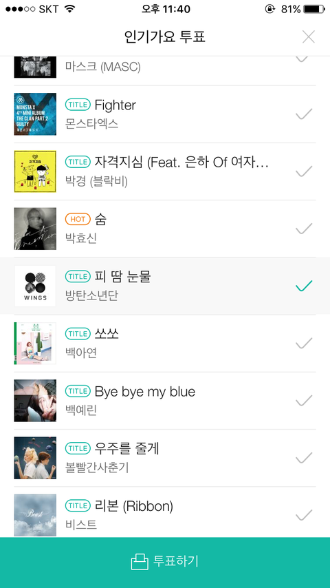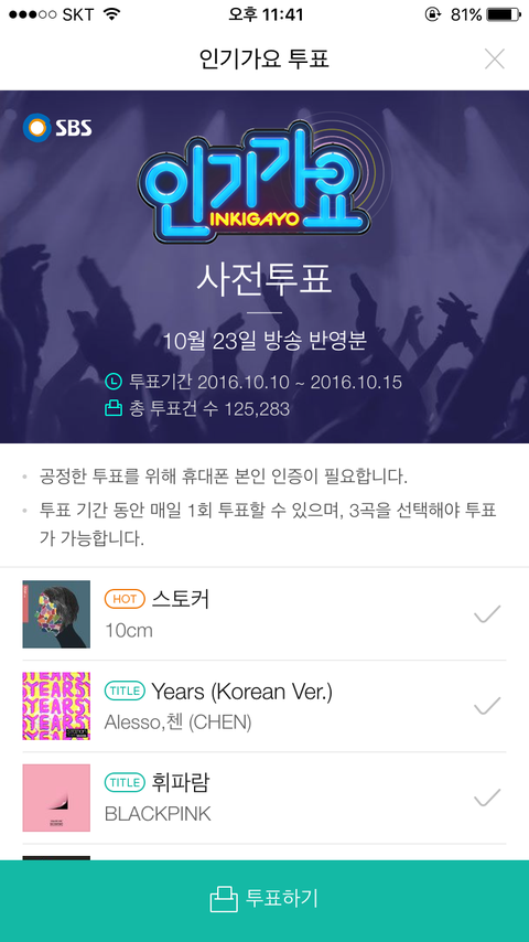 이거 담주 방송 사전투표라 상받는거랑 직접적으로 관련있어서 꼭꼭해야돼 ㅠㅠ 세곡투표하는거라 나머지 두표는 최신곡말고 예전곡위주로 투표하는거 알지??