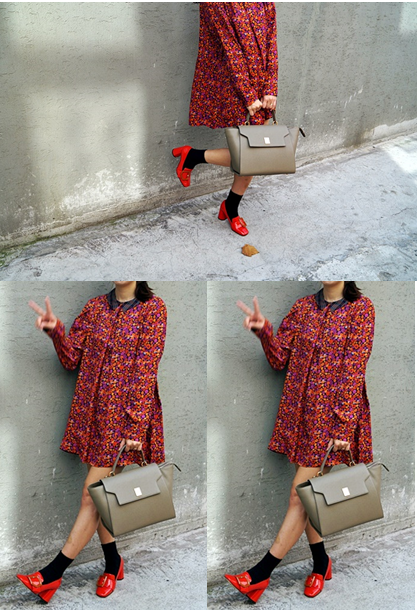 프린트 원피스랑 빨간 구두에 매치했는데도