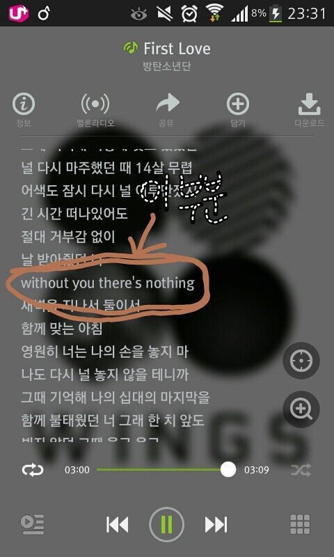 내가 갈색으로 동그라미 쳐놓은부분에 there's nothing 이 아니라 I'm nothing 이라고 들리지않아?