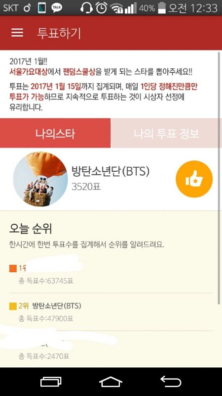 투표하고 있는 이삐들 한텐 미안한데 우리 진짜 투표수 차이봐 저번주? 얼마전까지만 해도 진짜 접전이었는데 투표 안하는 이삐들 제발 좀 하자 우리 ㅜㅜ