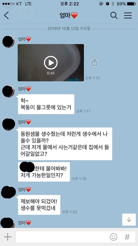생수에서 이상한 게 나왔다고 아래의 영상이랑 사진을 보내시더라구요.