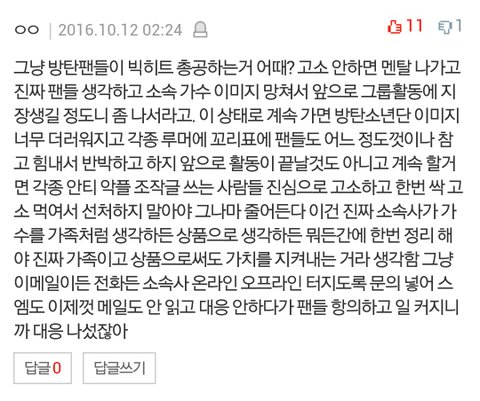 일 크게 만들지마라 하는 팬들이 있을거 같아서 말하는데 이렇게 가만히 있다간 이상한 루머들에 현혹되는 사람들이 많아질테고 애들 이미지는 나빠질거야.. 악플러들은 좋다고 더 날뛰고.. 지금 방1닷에서 진행하고 있긴 한데 방1닷은 방1닷대로 빅힛은 빅힛대로 딱 해줬으면 좋겠다 다시 5월 달 같은 상황이 되어가는거 같아..