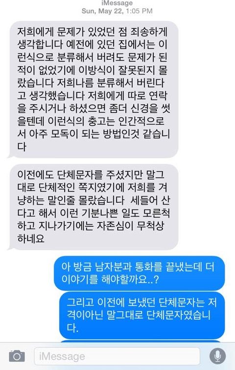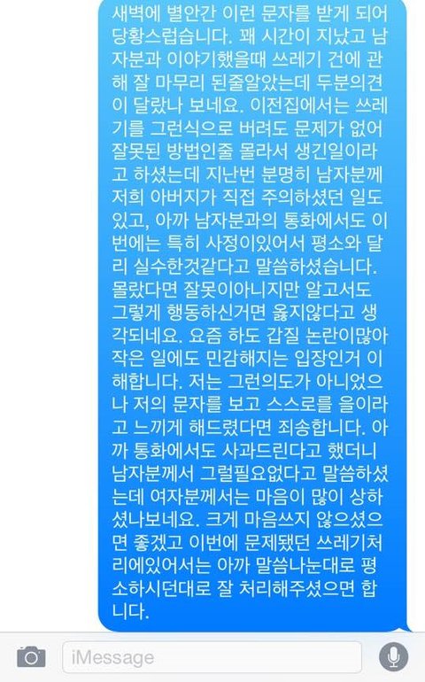 그 후로 해당호수 남자분으로부터 전화가 왔고 처음엔 화가 많이 났었지만 쓰레기 제대로 잘 버리겠다며 죄송하다는 연락을 받고 언니가 그래도 화가 나셨다니 사과드린다고 하니 아니라고 생각해보니까 2년간 솔직히 잘못버린게 맞는거같다고 하셔서 고모네는 정말 일이 잘풀린줄 알고 안도했는데,