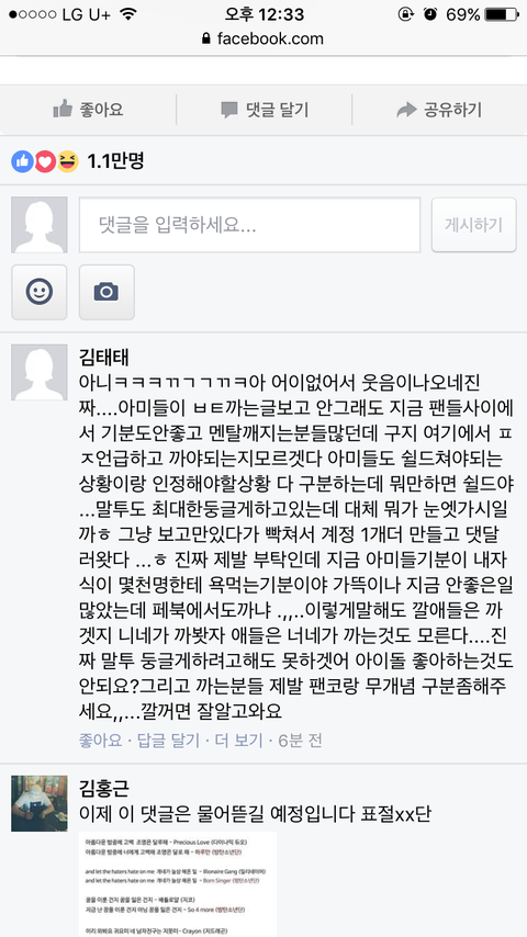 나 아까 얼굴책 계1정 1개더팠다는이삔데 암튼 내가 김태태...라고 계정이있어 근데 너무 까는글이많다 내가 말을잘못해서 해명글을올려야될지 모르겟다....일단 단독행동인것같아서 댓에 뭘 남기긴햇어 보면서 너무화가나더라 아미들은 다 욕먹고있어,.빅히트에 항의를 넣어도 그때까지 해결이 될런지 모르겟으니까 될수있으면 얼굴책 계1정을 따로 만들어놔야될것같아 해명글올리면 해1킹당할수도있으니까 일단 내가 해명글은 아니더라도 좀 따지듯이 말햇어 ...문제되면 삭할게