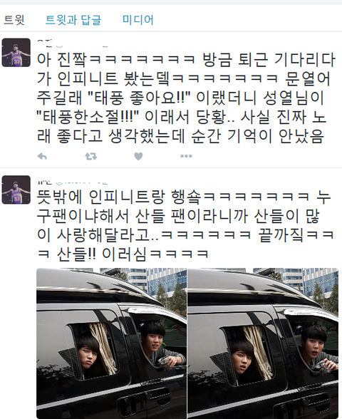 방금전에 음중 퇴근길에 비포용지에이포용지 에서 솔로로 나오신 산들산들바람님 팬분이 우연히 성열이랑 우현이랑 퇴근길 차타고 창문내려서 이야기 했는데 태풍노래 좋아요~ 하니까 이성열이 태풍 한소절 시킴 ㅋㅋㅋㅋㅋ.... 누가 이성열 아니랄까봐. 그와중에 나만 이사진에 성열이랑 우현이 깨알플레이어 할 때 생각나나? 그때 내꺼하자 할때 쯔음에 이성열 흑발이였는데 이거 커피들고 찍힌사진 완전 예전 판박이인데? 남횬도 완전 그대로 ㅋㅋㅋㅋㅋㅋ 진짜 세월은 흐르고 나만 늙고 애들은 그대로 인 것 같아서 슬픔 낼 막방 이성열이 이성종 제스쳐 따라하는거 기대기대