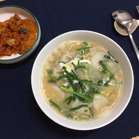 멸치다시육수 + 떡,만두 + 생부추 = muy bien!❤️